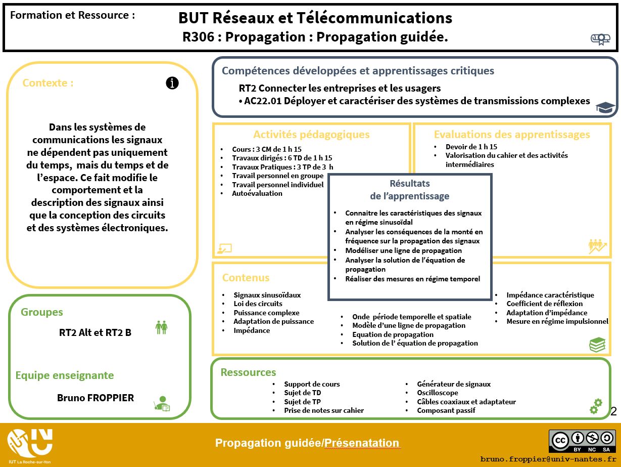 Signaux sinusoïdaux ; Loi des circuits ; Puissance complexe ; Adaptation de puissance ; Impédance ; Onde période temporelle et spatiale ; Modèle d’une ligne de propagation ; Equation de propagation ; Solution de l’ équation de propagation ; Impédance caractéristique ; Coefficient de réflexion ; Adaptation d’impédance ; Mesure en régime impulsionnel.